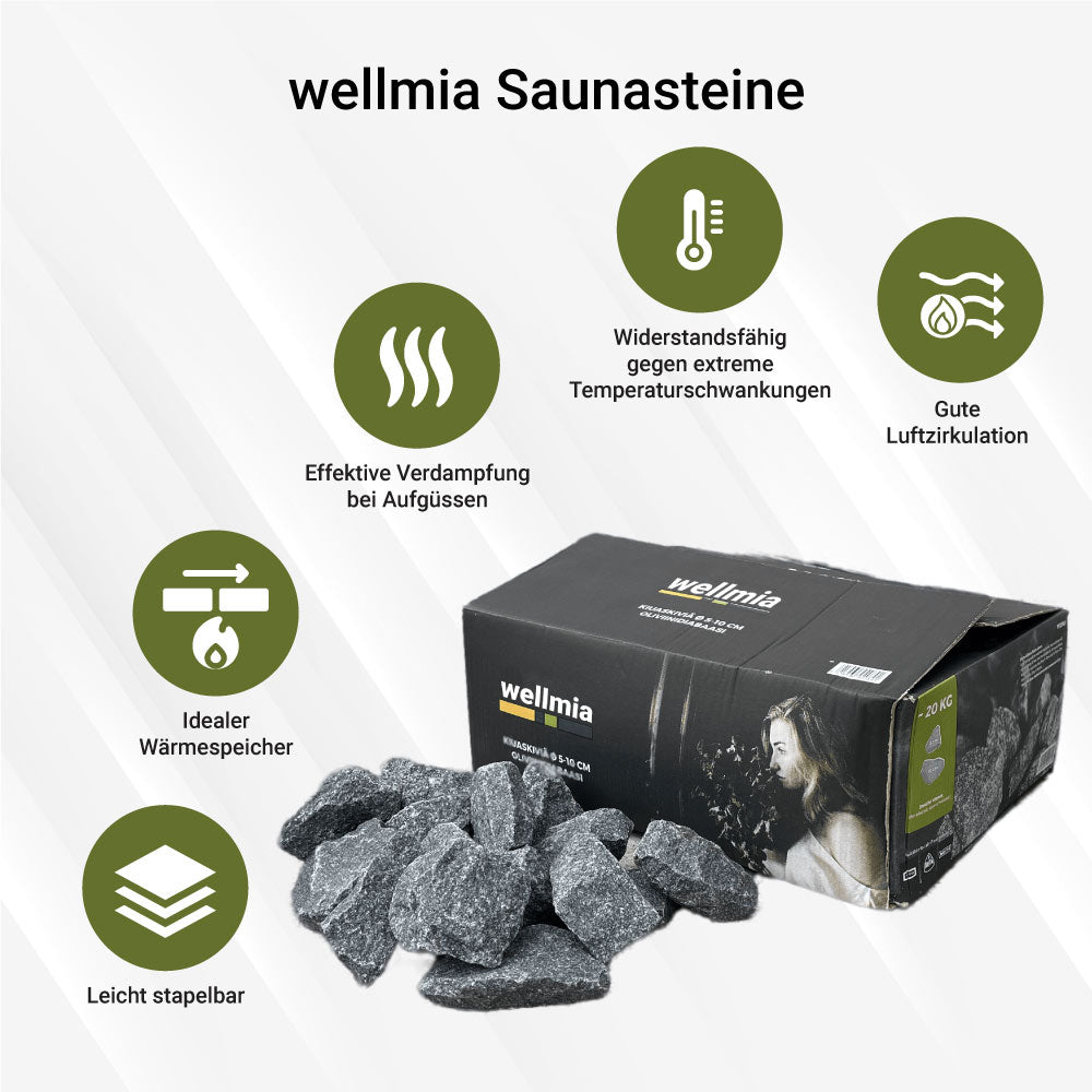 wellmia® Saunasteine | 20 kg | 5-10 cm oder 10-15 cm | Sauna Steine für Holz- und Elektroöfen